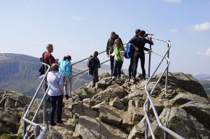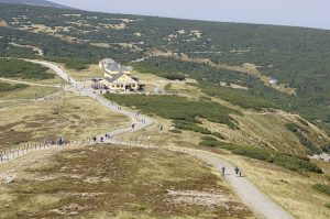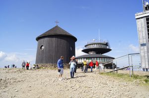 Von der Spitze der Schneekoppe bietet sich eine fantastische Aussicht über das Riesengebirge und die Vorgebirgslandschaft. Schon seit 1681 trotzt die kleine hölzerne Laurentius-Kapelle Wind und Wetter. Gleich nebenan befindet sich die futuristische Wetterwarte. Das Restaurant in dem Gebäude ist momentan geschlossen, aber gleich nebenan gibt es auf tschechischer Seite einen Kiosk. Dort befindet sich auch die Endstation einer Gondelbahn, die vom tschechischen Ferienort Pec (Petzer) aus direkt zur Spitze des Bergs führt.